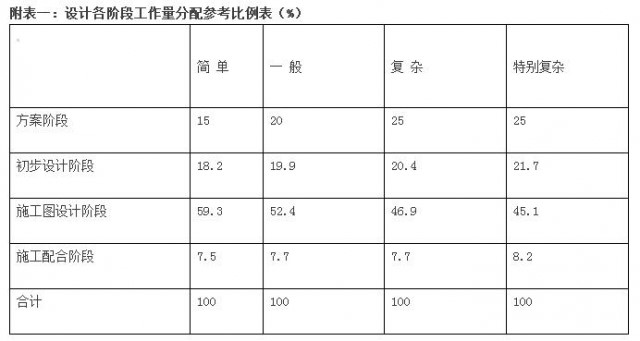 定額》(住房和城鄉(xiāng)建設(shè)部頒發(fā)),詳見附表一《設(shè)計各階段工作量分配參考比例表》。